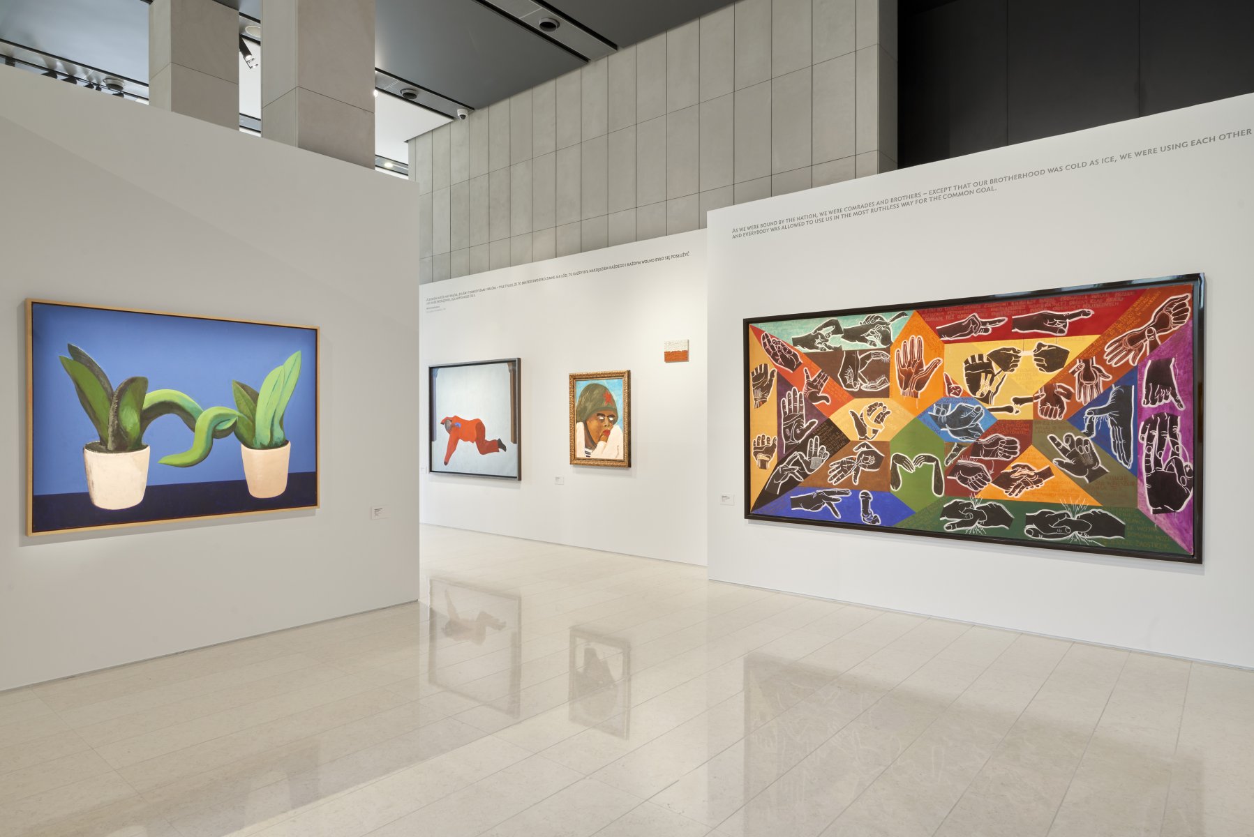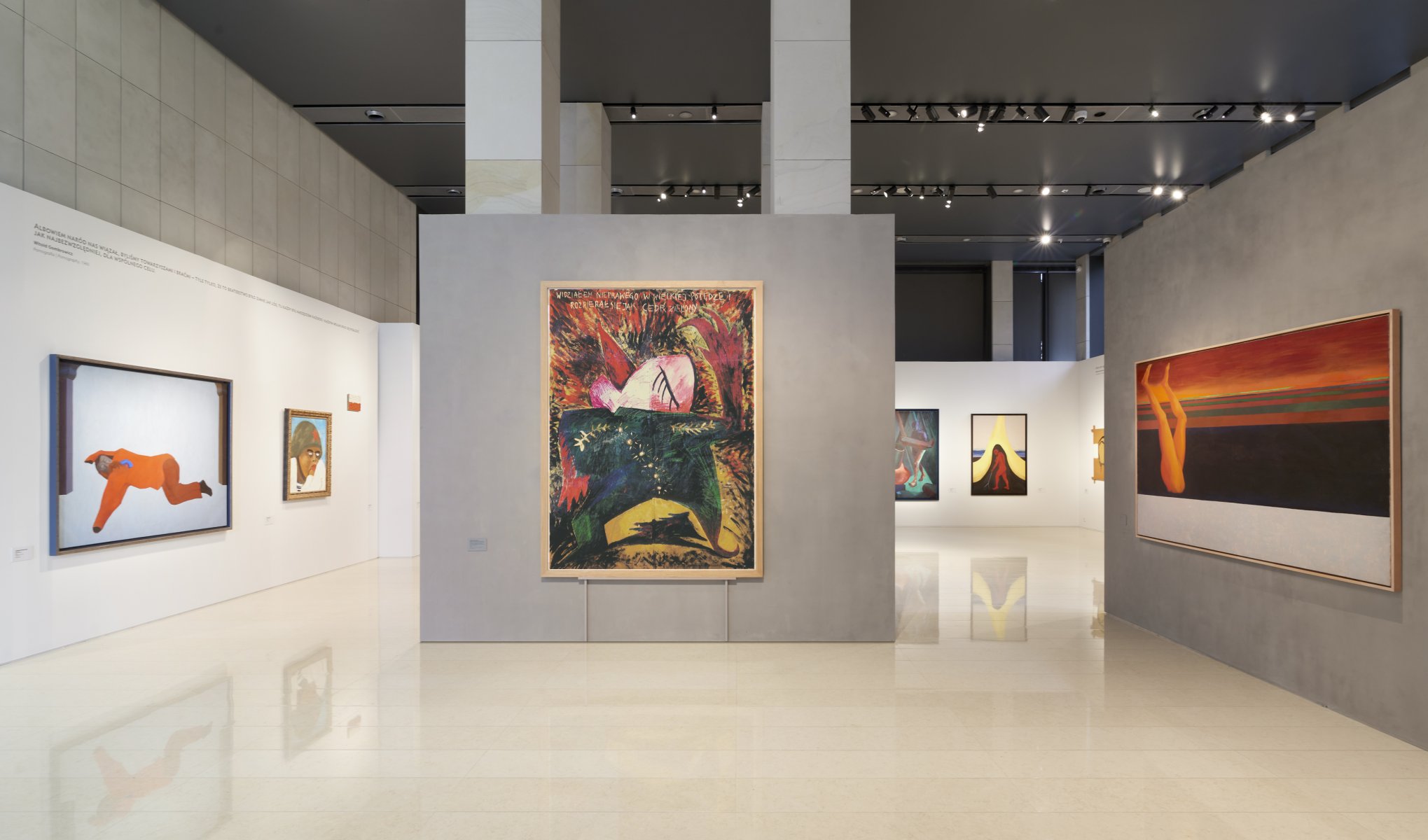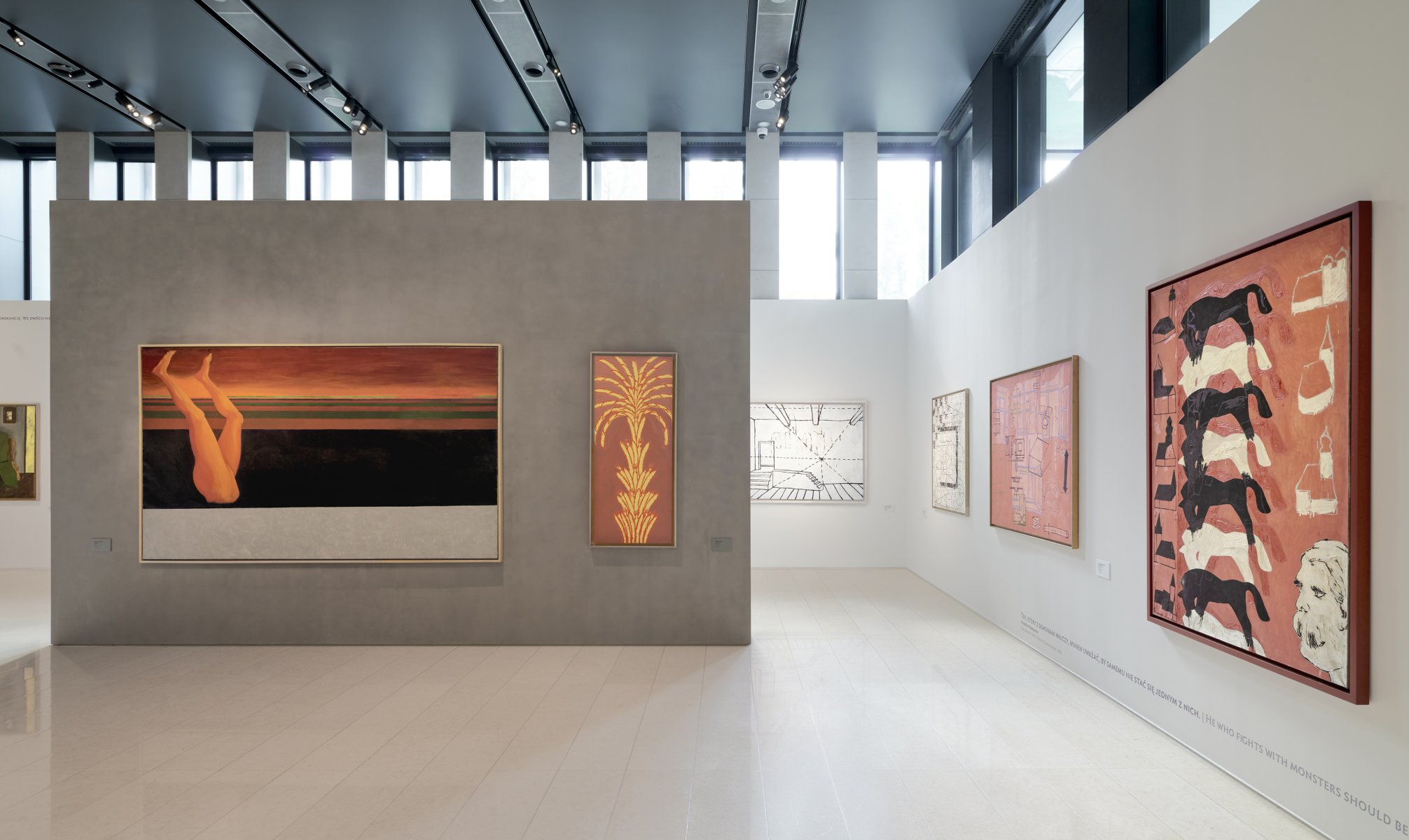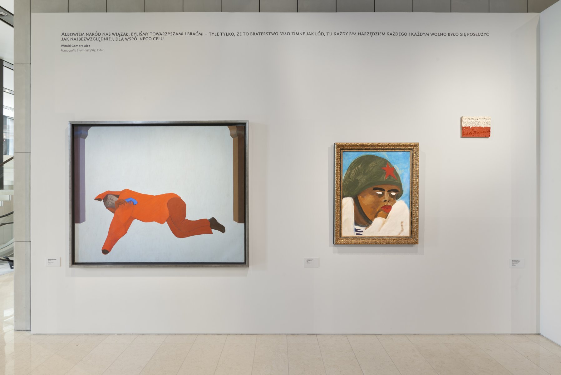 Wśród prezentowanych na wystawie prac znajduje się jedno z najbardziej emblematycznych dzieł Marka Sobczyka – monumentalne płótno „Gdzie się jeszcze w Polsce biją” z 1988 roku. Ten obraz, powstały u progu transformacji ustrojowej, w symboliczny sposób obnaża absurd przemocy i dziedzictwa konfliktów, które ciążyły nad światem w latach 80-tych. W szczególny sposób na wystawie wybrzmiewa „Mon Cheri Bolshevique” Pawła Kowalewskiego z 1984 roku - dzieło osadzone w tragicznym paradoksie polsko-rosyjskich relacji: pełne ironii, ale i przestrogi, balansujące między fascynacją rosyjską kulturą i duchowością a świadomością jej brutalnego, imperialnego dziedzictwa. Obok – pełne energii gwasze Ryszarda Grzyba, operujące ostrym humorem i literackim tytułem jako nośnikiem wielowarstwowych znaczeń. Ich ironiczna forma stanowi kontrapunkt wobec ciszy i napięcia obrazów Jarosława Modzelewskiego, takich jak monumentalny„Sen z bronią”. Postać w czerwonym garniturze z pistoletem zasłaniającym twarz, zredukowana niemal do znaku, przywołuje ducha odindywidualizowanych figur Wróblewskiego z jego „Rozstrzelań”, zderzając intymność jednostkowego koszmaru z uniwersalnym lękiem. W „Budowniczym” Ryszarda Woźniaka – dziele o skali fresku i intensywnej kolorystyce – pojawia się figura człowieka „do góry nogami” - uczestniczącego, być może, w budowie systemu, którego sensu nie rozumie i nad którego logiką nie panuje. Obraz ten staje się trafnym komentarzem do roli artysty i obywatela w świecie. „Chwila, w której człowiek i pies czują ten sam ból istnienia” Włodzimierza Pawlaka z 1986 roku to obraz, na którym malowane czarną ociekającą farbą kontury dwóch głów – ludzkiej i psiej – spotykają się na tle białego pasa malowanego wałkiem, przywołującego brutalistyczną estetykę PRL-owskiej cenzury. To celowe nawiązanie artysty do zamalowywanych przez milicję haseł ówczesnej opozycji, a jednocześnie egzystencjalny manifest.