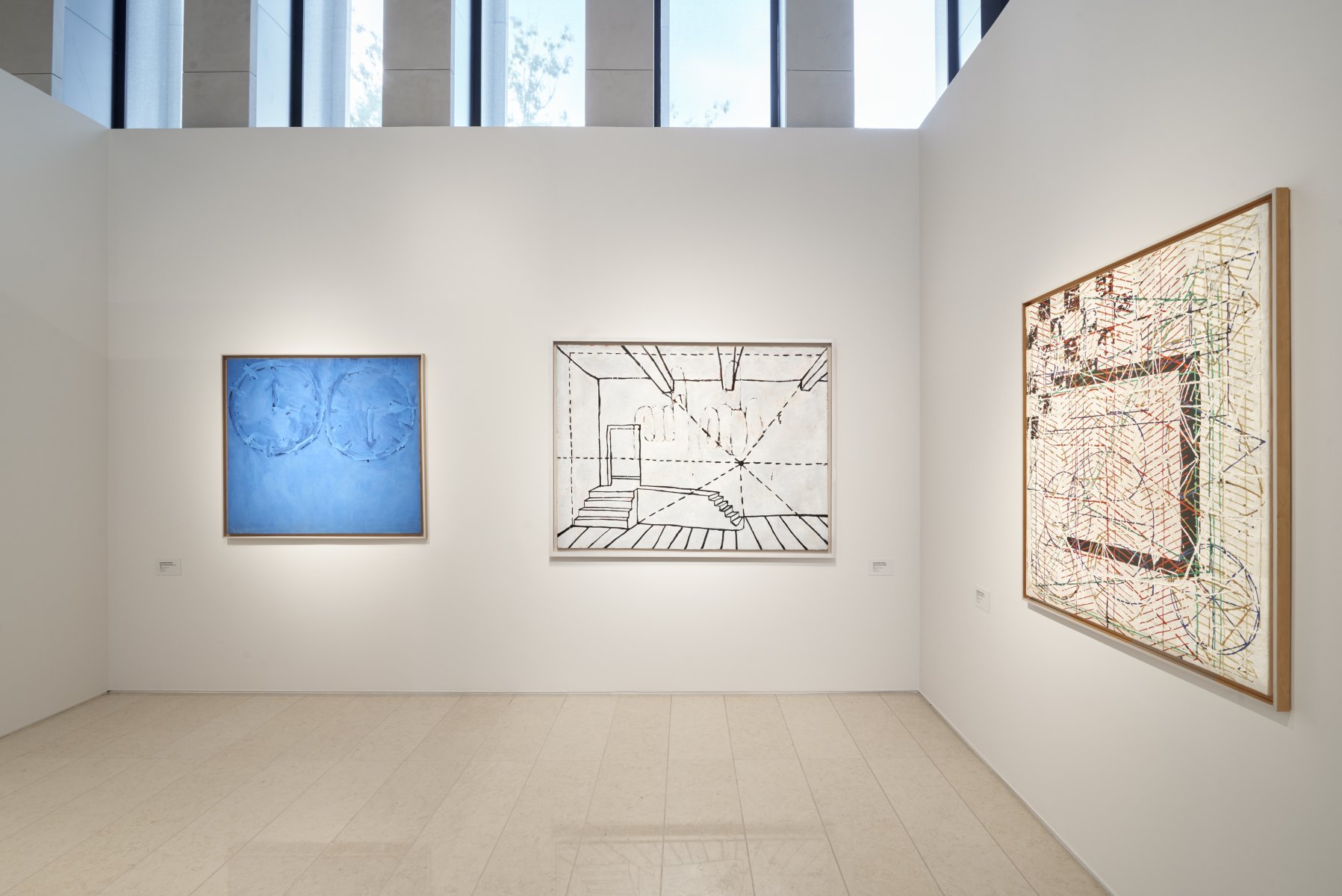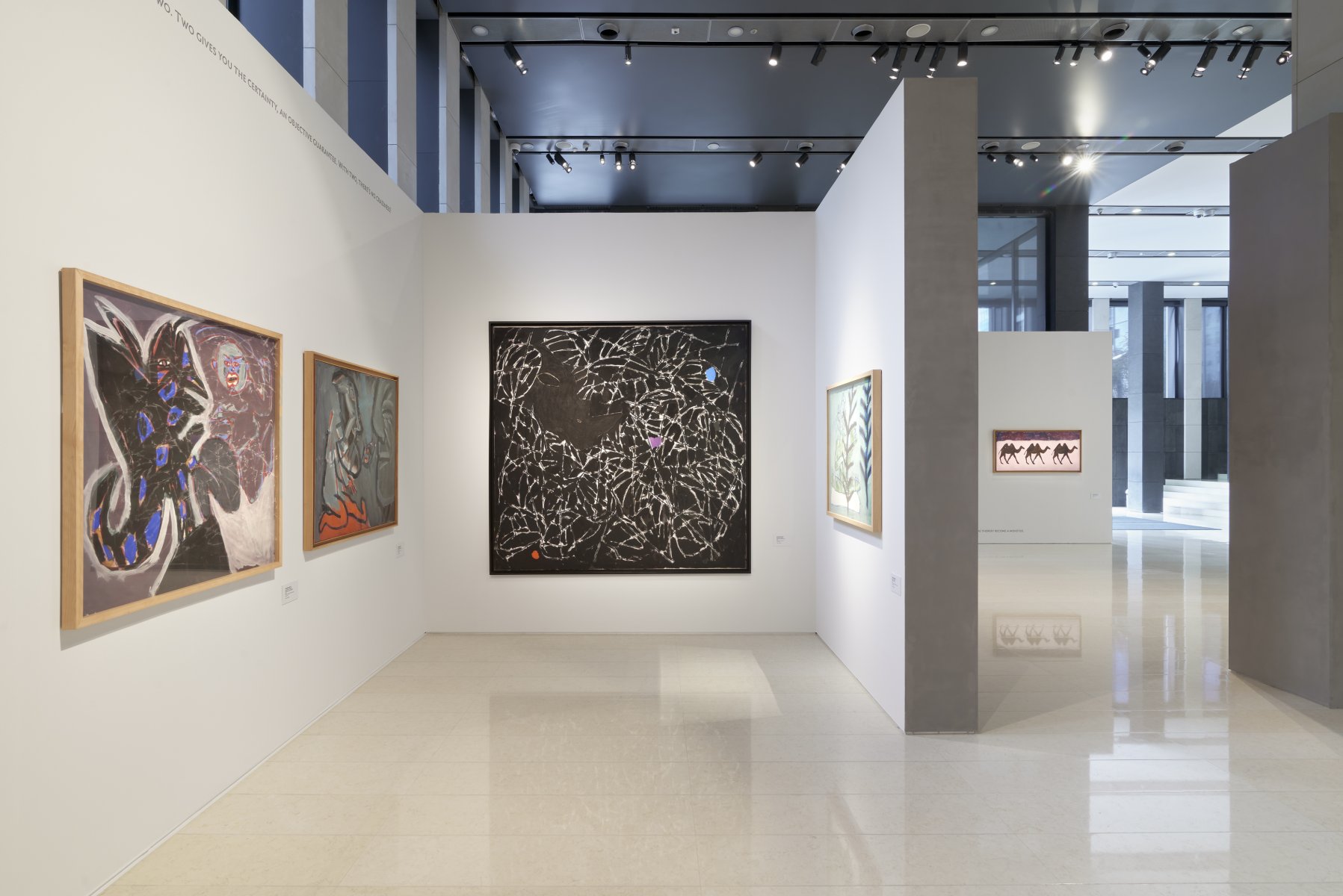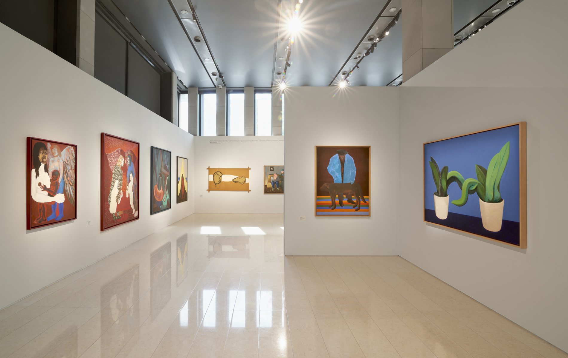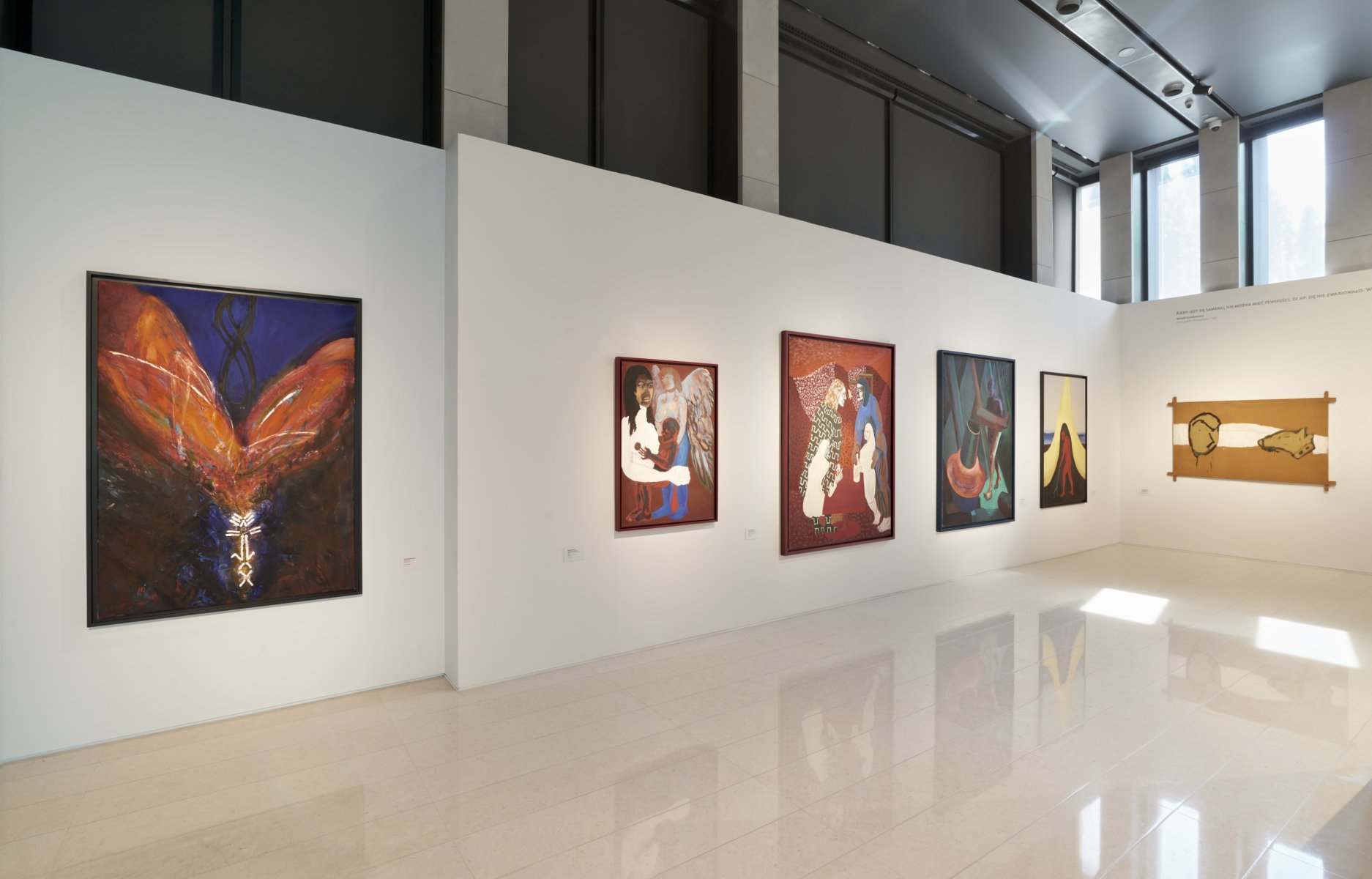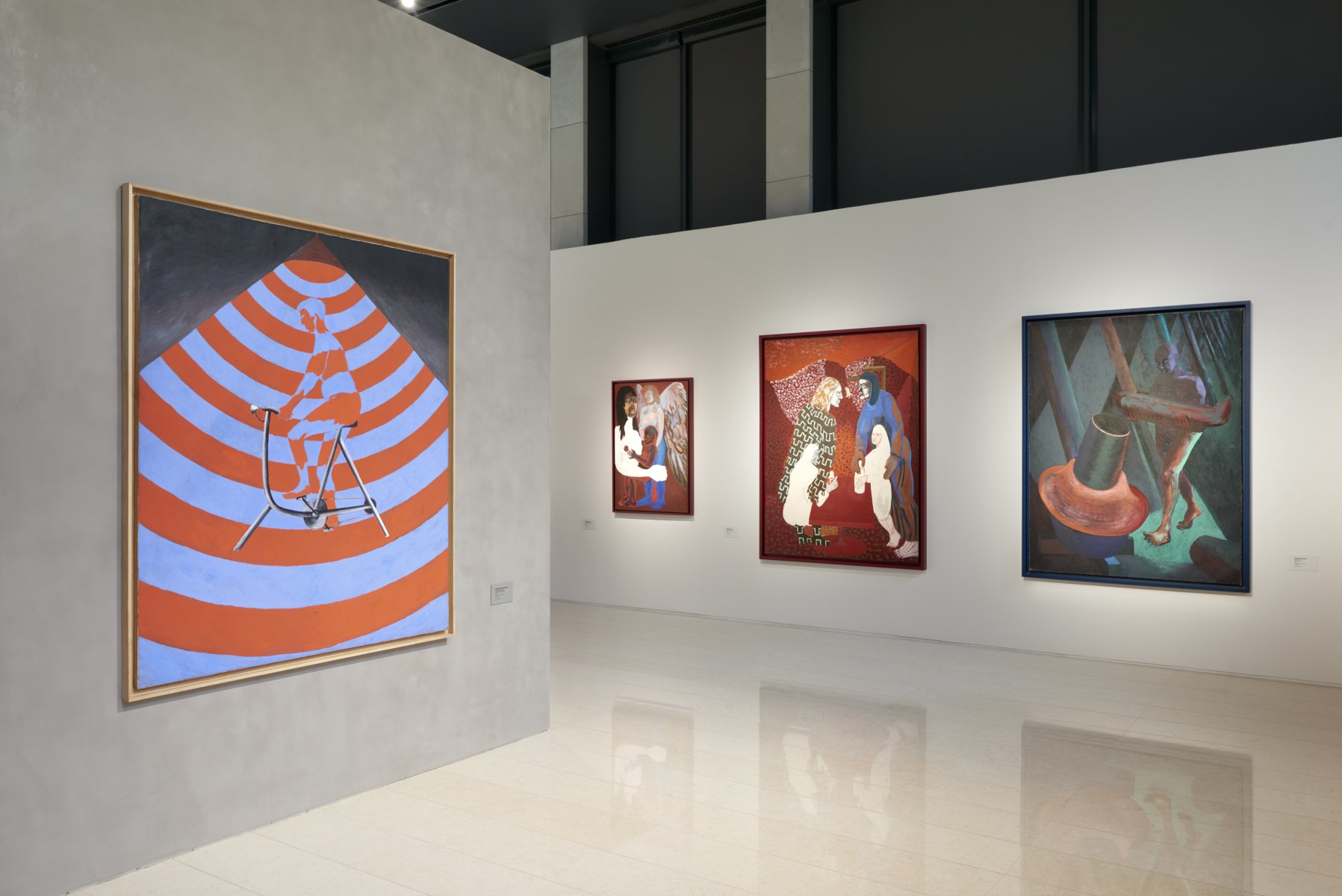 Wśród prezentowanych na wystawie prac znajduje się jedno z najbardziej emblematycznych dzieł Marka Sobczyka – monumentalne płótno „Gdzie się jeszcze w Polsce biją” z 1988 roku. Ten obraz, powstały u progu transformacji ustrojowej, w symboliczny sposób obnaża absurd przemocy i dziedzictwa konfliktów, które ciążyły nad światem w latach 80-tych. W szczególny sposób na wystawie wybrzmiewa „Mon Cheri Bolshevique” Pawła Kowalewskiego z 1984 roku - dzieło osadzone w tragicznym paradoksie polsko-rosyjskich relacji: pełne ironii, ale i przestrogi, balansujące między fascynacją rosyjską kulturą i duchowością a świadomością jej brutalnego, imperialnego dziedzictwa. Obok – pełne energii gwasze Ryszarda Grzyba, operujące ostrym humorem i literackim tytułem jako nośnikiem wielowarstwowych znaczeń. Ich ironiczna forma stanowi kontrapunkt wobec ciszy i napięcia obrazów Jarosława Modzelewskiego, takich jak monumentalny„Sen z bronią”. Postać w czerwonym garniturze z pistoletem zasłaniającym twarz, zredukowana niemal do znaku, przywołuje ducha odindywidualizowanych figur Wróblewskiego z jego „Rozstrzelań”, zderzając intymność jednostkowego koszmaru z uniwersalnym lękiem. W „Budowniczym” Ryszarda Woźniaka – dziele o skali fresku i intensywnej kolorystyce – pojawia się figura człowieka „do góry nogami” - uczestniczącego, być może, w budowie systemu, którego sensu nie rozumie i nad którego logiką nie panuje. Obraz ten staje się trafnym komentarzem do roli artysty i obywatela w świecie. „Chwila, w której człowiek i pies czują ten sam ból istnienia” Włodzimierza Pawlaka z 1986 roku to obraz, na którym malowane czarną ociekającą farbą kontury dwóch głów – ludzkiej i psiej – spotykają się na tle białego pasa malowanego wałkiem, przywołującego brutalistyczną estetykę PRL-owskiej cenzury. To celowe nawiązanie artysty do zamalowywanych przez milicję haseł ówczesnej opozycji, a jednocześnie egzystencjalny manifest.